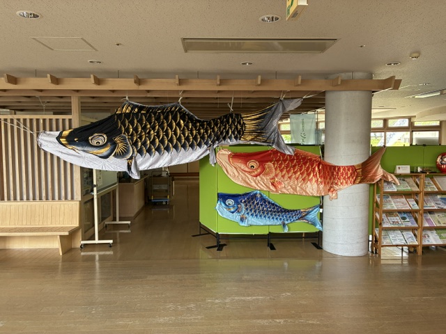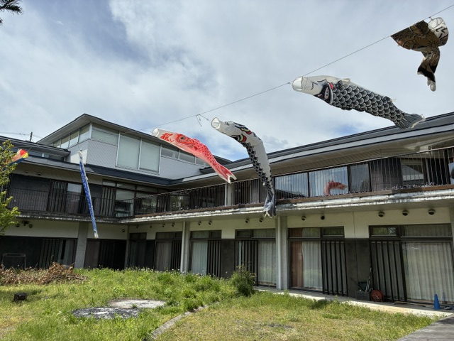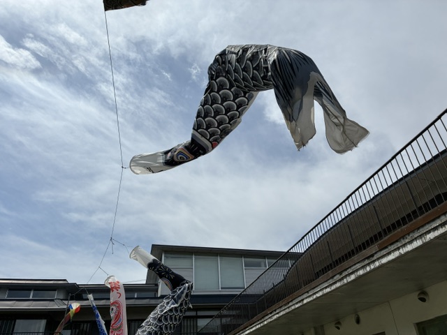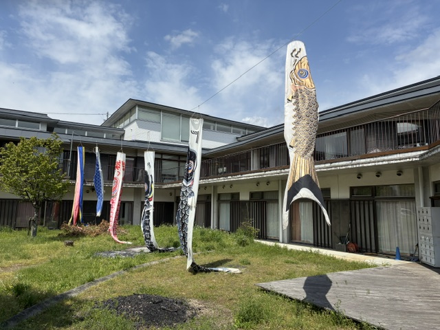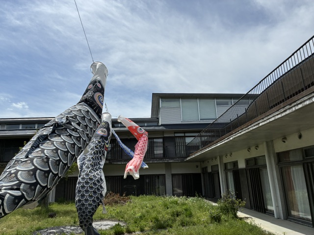 今年も特養あさぎりの郷に鯉のぼりがお目見えし、風に乗ってスイスイ泳いでいます。エントランスにも大きな鯉のぼりが飾られました。