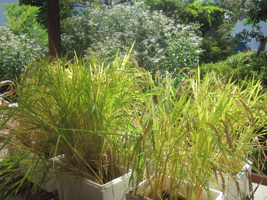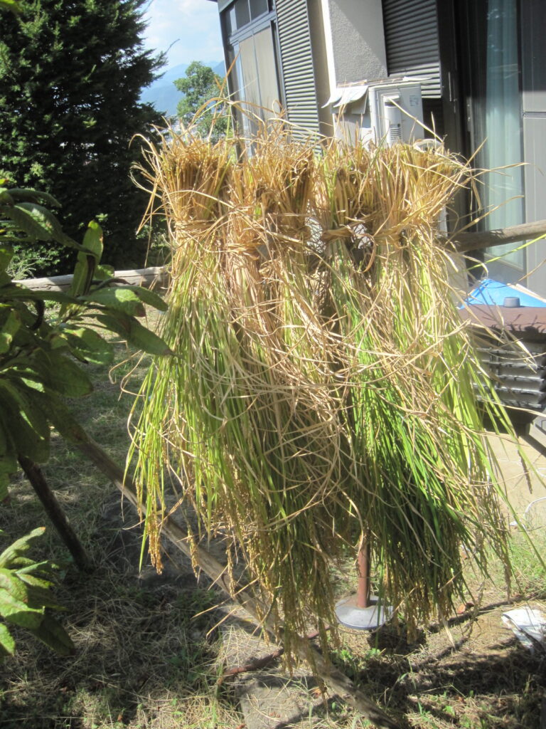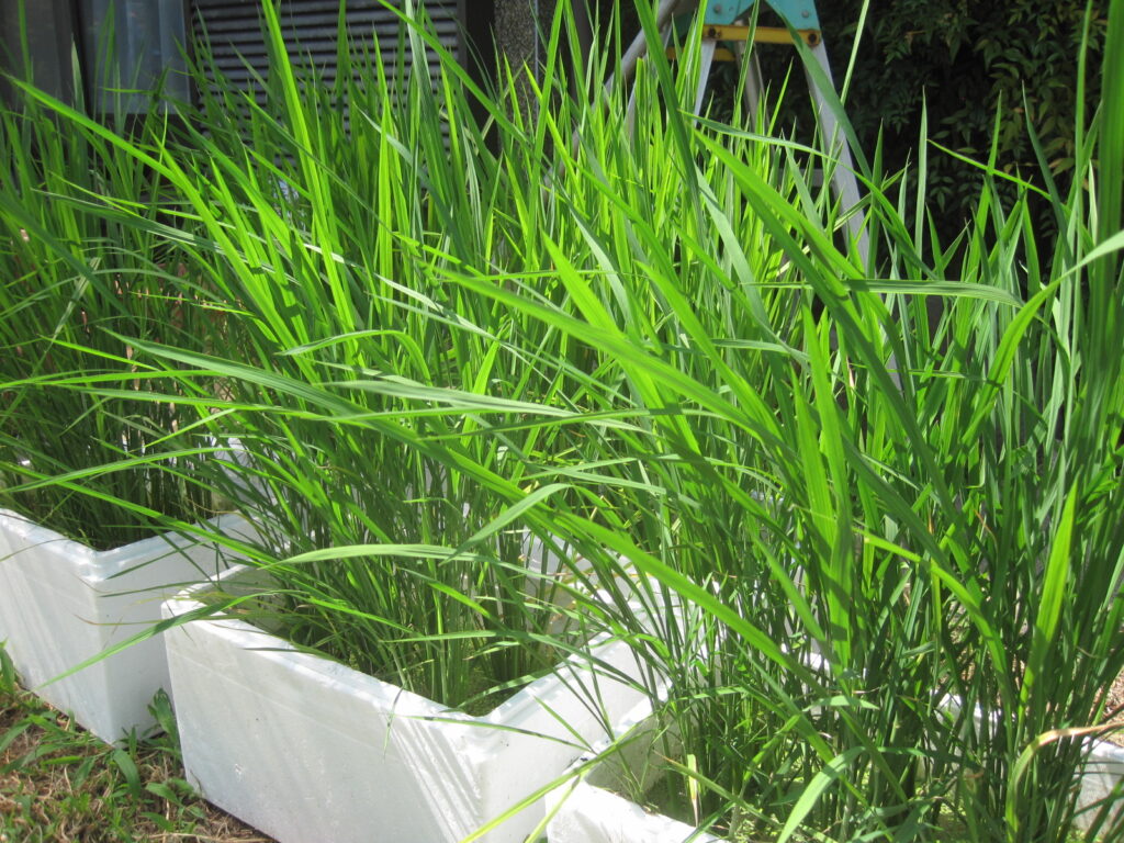 4月末発泡スチロール田に苗植え 7月には 青々と元気に成長 9月稲穂も重くなりました