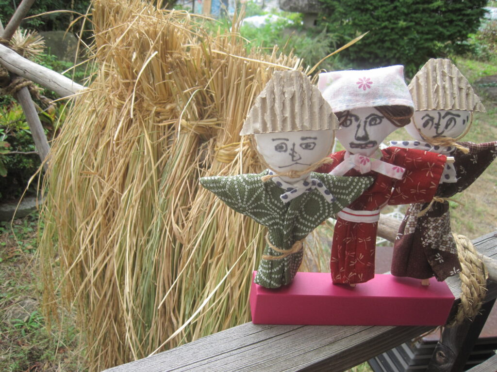 昔ながらの鎌で稲刈り ハゼ掛けで天日干し 案山子さんがスズメから守ります
