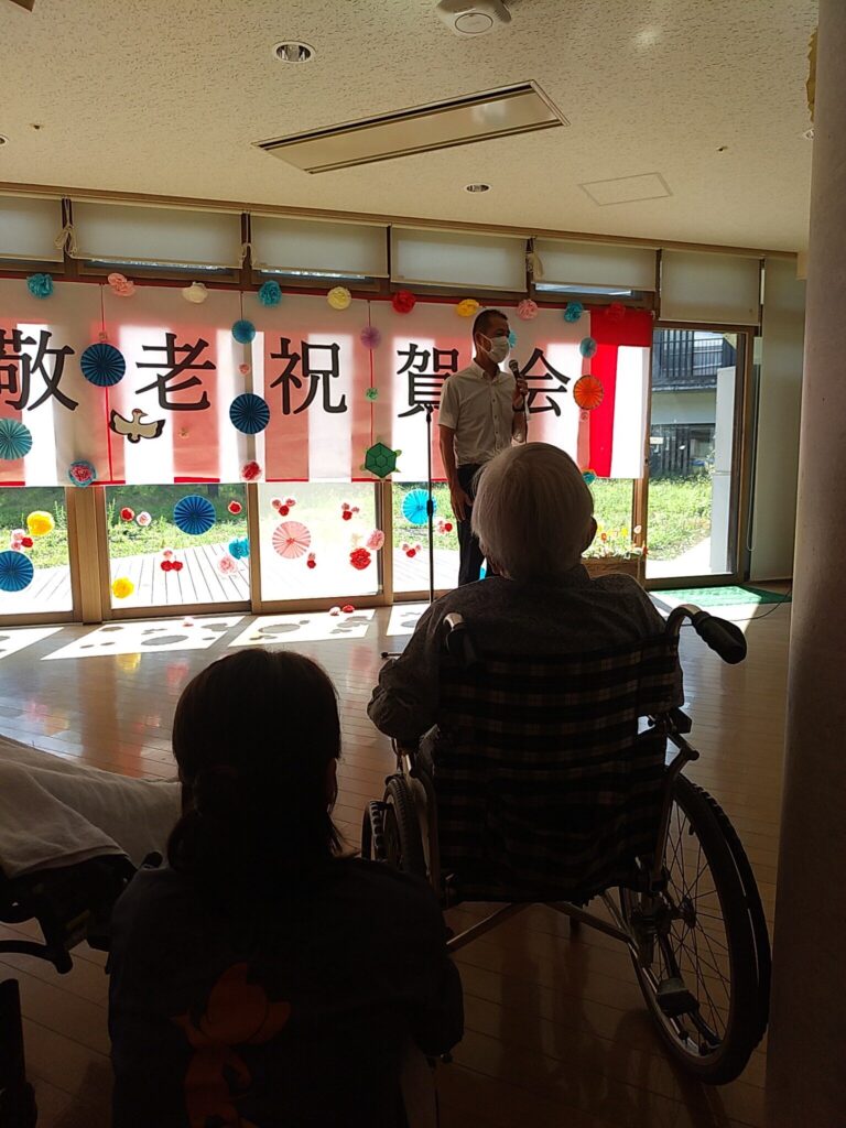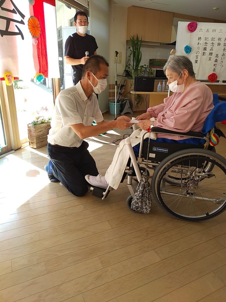 敬老祝賀会を開催しました。 2025.09.22 あさぎりの郷で敬老祝賀会を開催し、高森町の壬生村長さんがお祝いに駆け付けてくれました。米寿、白寿および100歳以上のご利用者様にお祝いの品が送られました。