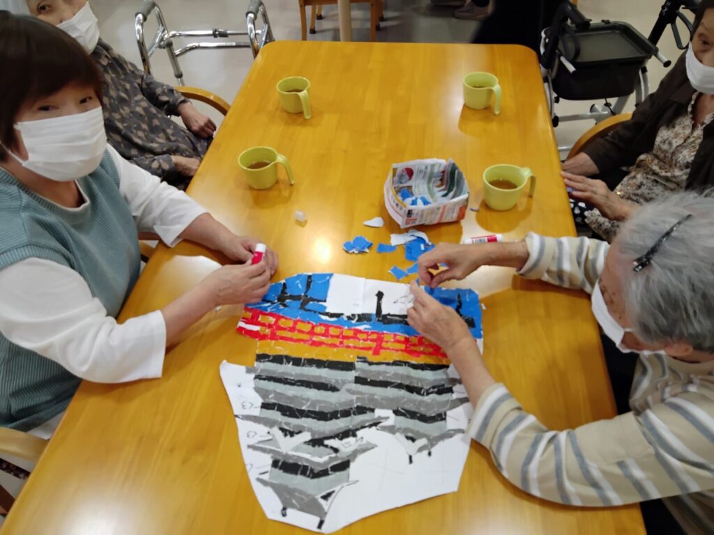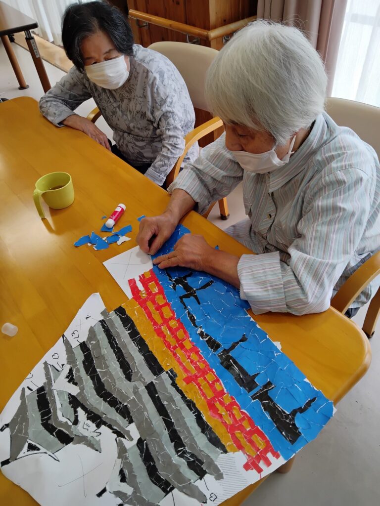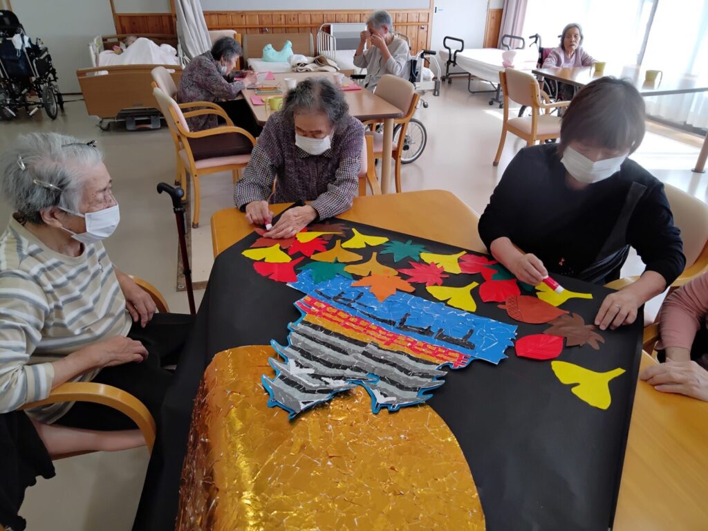 うつくしの里デイサービスセンターでは午前中の余暇時間や午後のレクリエーションの時間を使って、利用者さんと季節に合わせた壁画作りを毎月行っております。