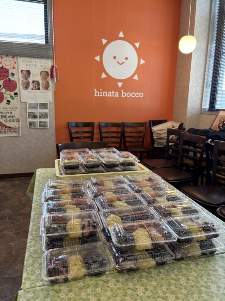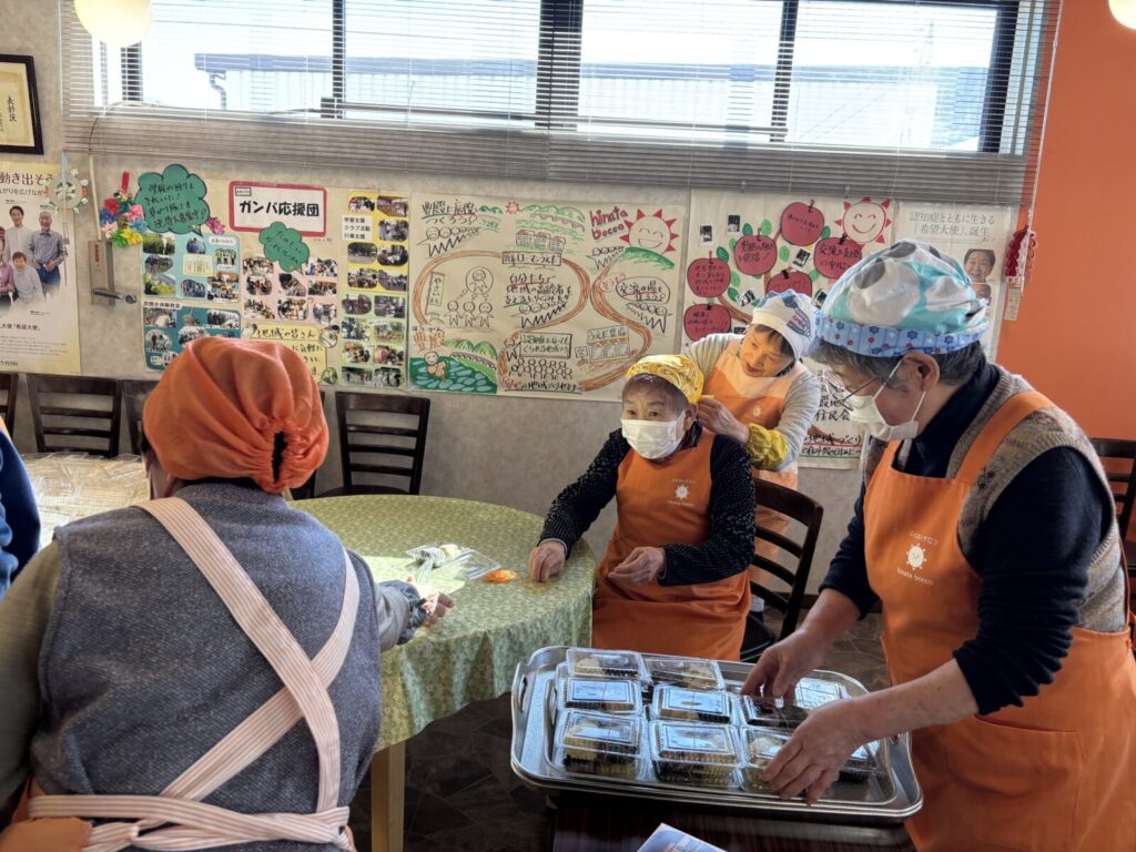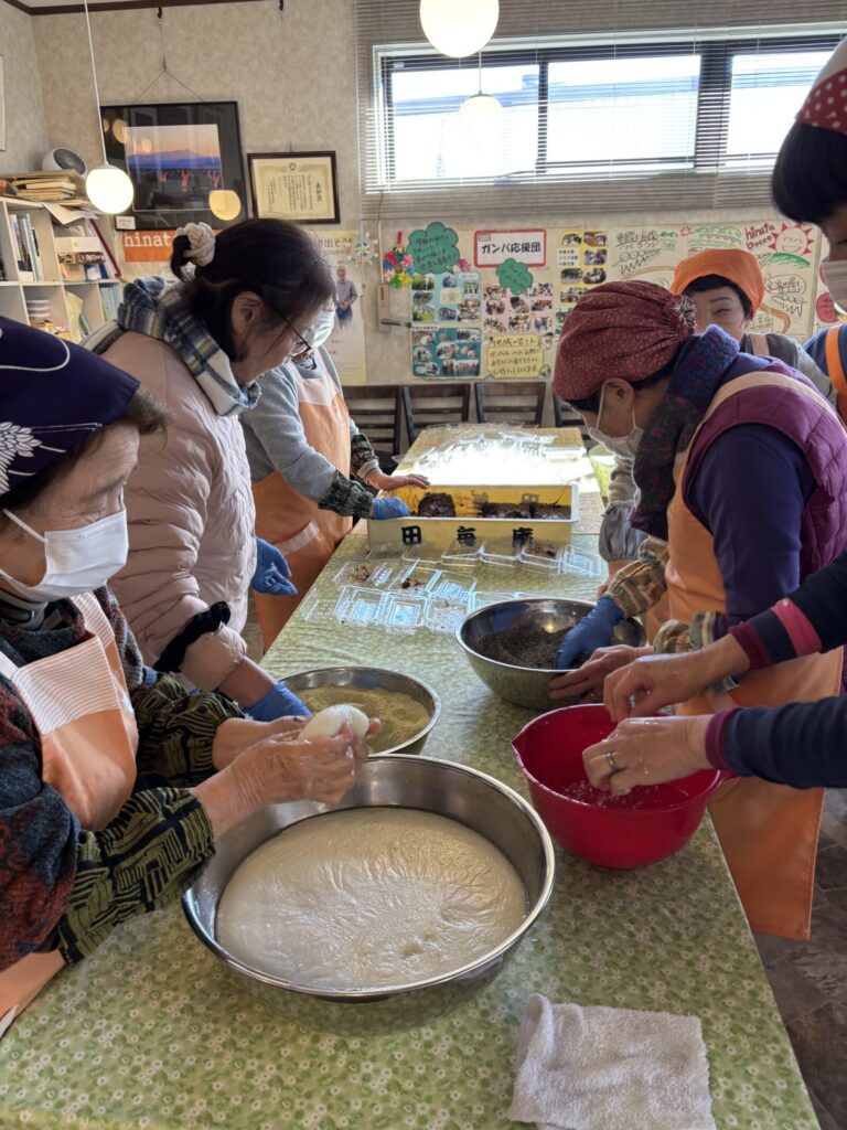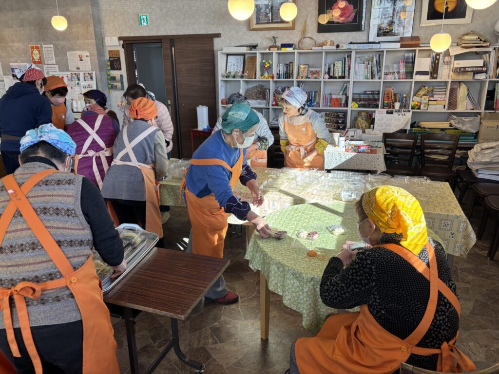 hinataboccoの中の様子。ボランティアの方々が手際よく餅を丸めてパックに入れていきます。そこには、認知症希望大使の春原さんの姿も・・。お手伝いに大活躍。