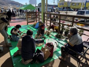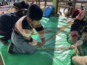 豊殿の家のテラスでは、しめ飾り作りの講習も行われました。中から眺める利用者の方は、「皆、どこの家でも、やったもんだよね~」としみじみ。子供からお年寄りまで楽しめる、多世代交流の場となりました。