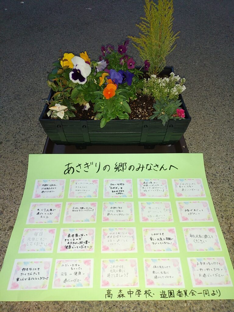高森中学校造園委員会よりお花を頂きました。 2025.12.10 高森中学校造園委員会の生徒さんより綺麗なお花をいただきました。可愛らしいお花の寄せ植えに、利用者さまへの温かいメッセージが添えられていました。