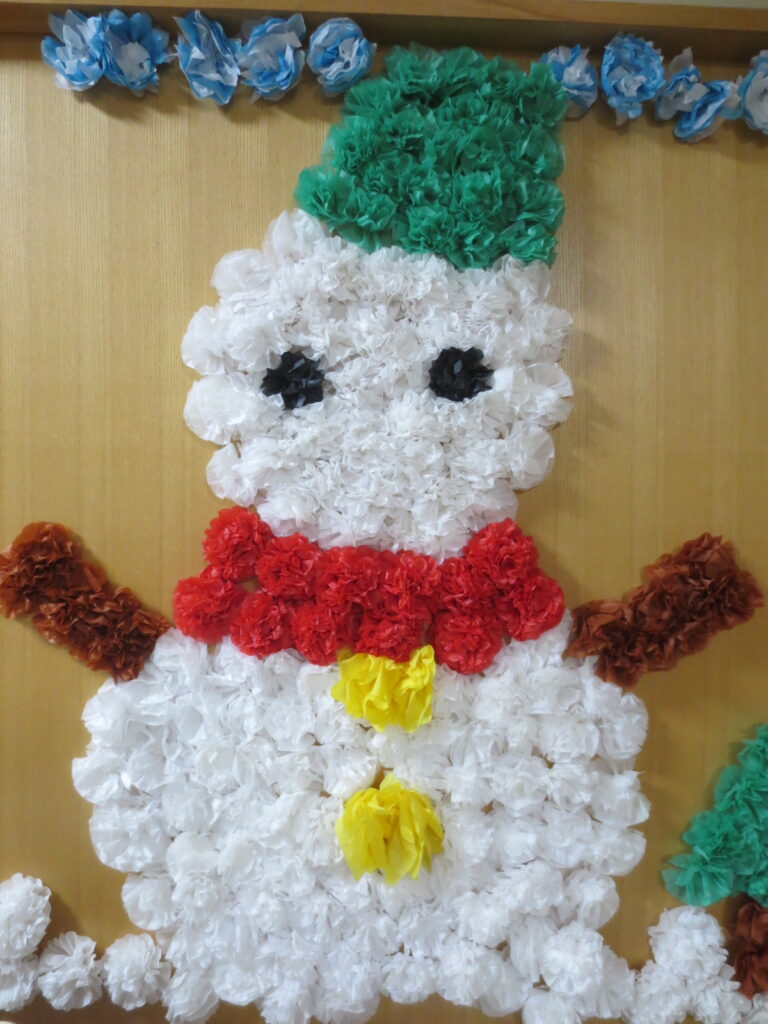 雪だるまは利用者さんと職員のお手製お花紙を雪だるま型に飾りました☃切り絵は職員が頑張っちゃいました(笑)