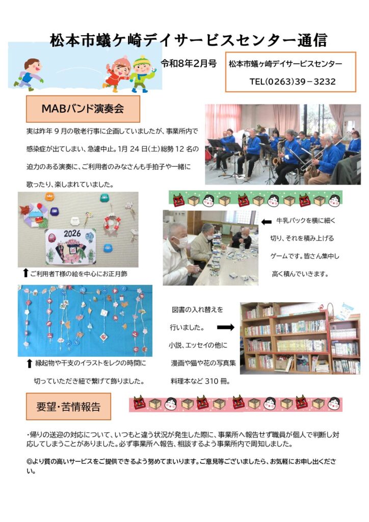 『蟻ケ崎デイサービスセンター通信』を発行しました 2026.02.05 Warning: Undefined array key "file" in /home/kir017761/public_html/site/wp-includes/media.php on line 1788 こんにちは、蟻ケ崎デイサービスセンターです。 「蟻ケ崎デイサービスセンター通信 2月号」を発行しました☃️❄️ ぜひご覧ください。