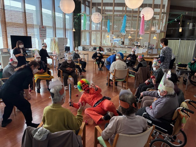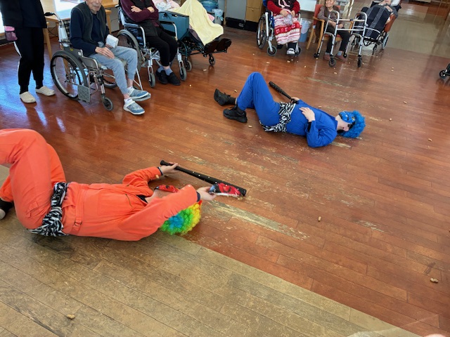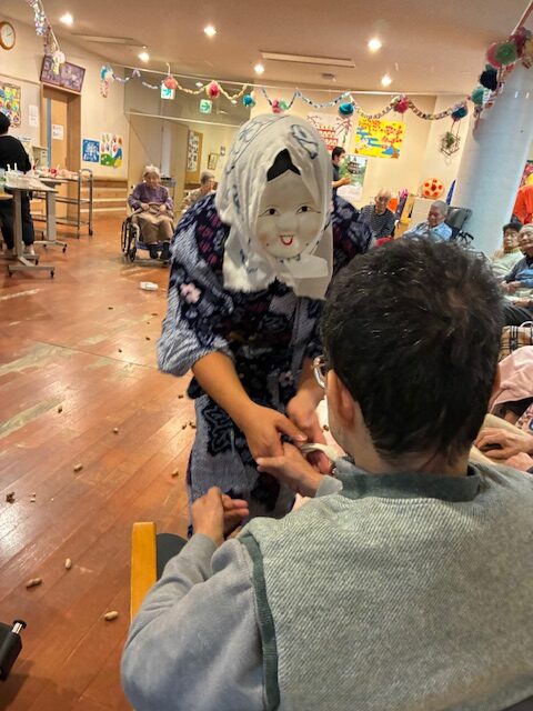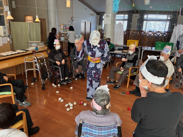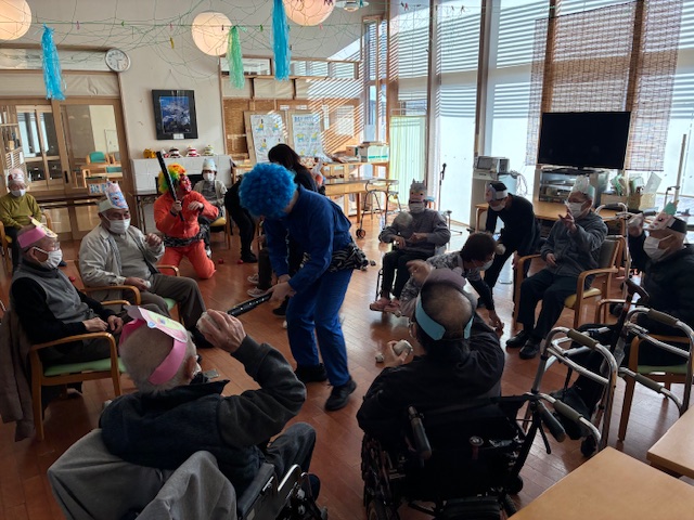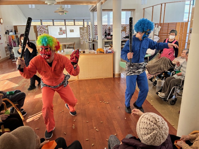 節分の日、あさぎりの郷で豆まきを行いました。職員が鬼に扮して利用者様が豆を投げ、鬼退治をしてもらいました。