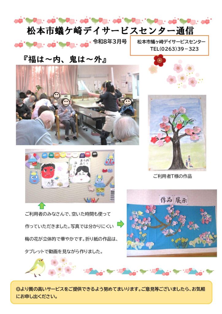 「蟻ケ崎デイサービスセンター通信3月号」を発行しました 2026.03.05 Warning: Undefined array key "file" in /home/kir017761/public_html/site/wp-includes/media.php on line 1788 こんにちは、蟻ケ崎デイサービスセンターです! 「蟻ケ崎デイサービスセンター通信3月号」を発行しました🌸 ぜひご覧ください。