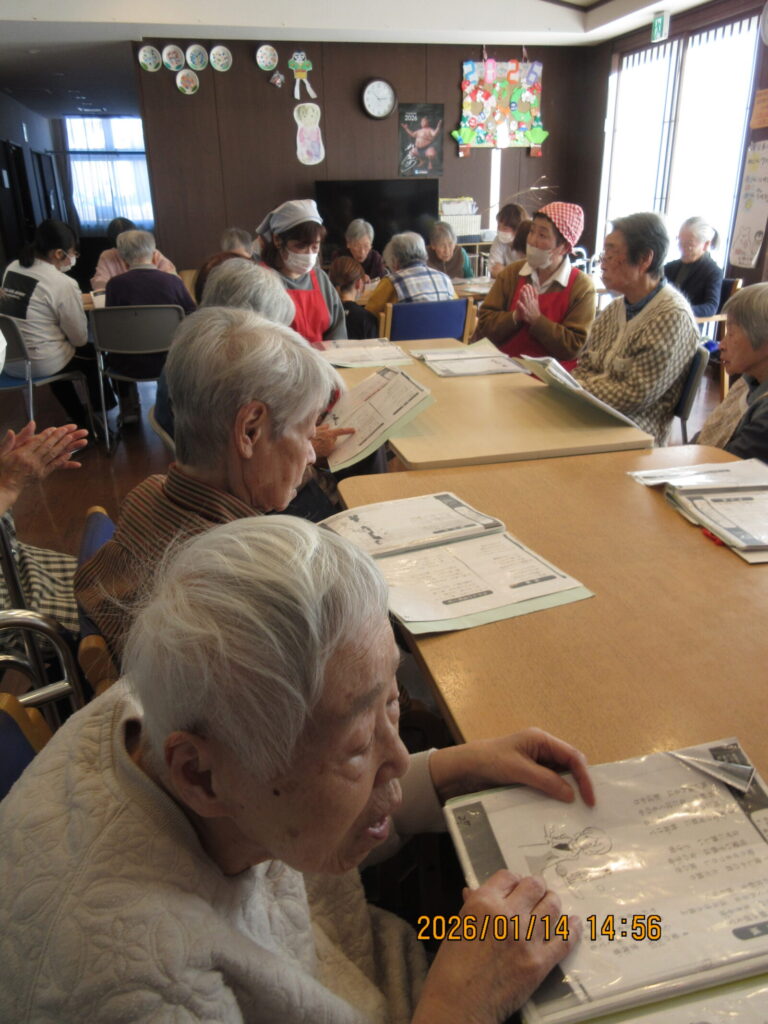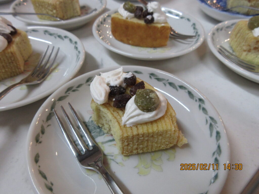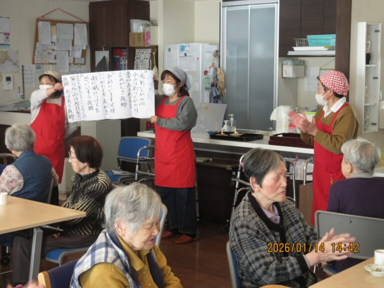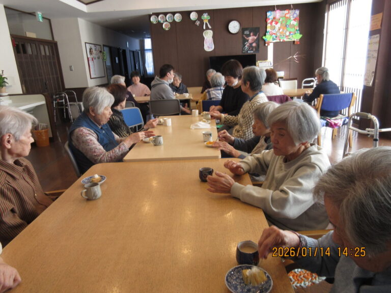 1月は、ドリップコーヒーの他、女性部の方が目の前で手作りのお菓子を作って下さり、誕生日の方のお祝いや、歌、体操などのレクリエーションを行いました。