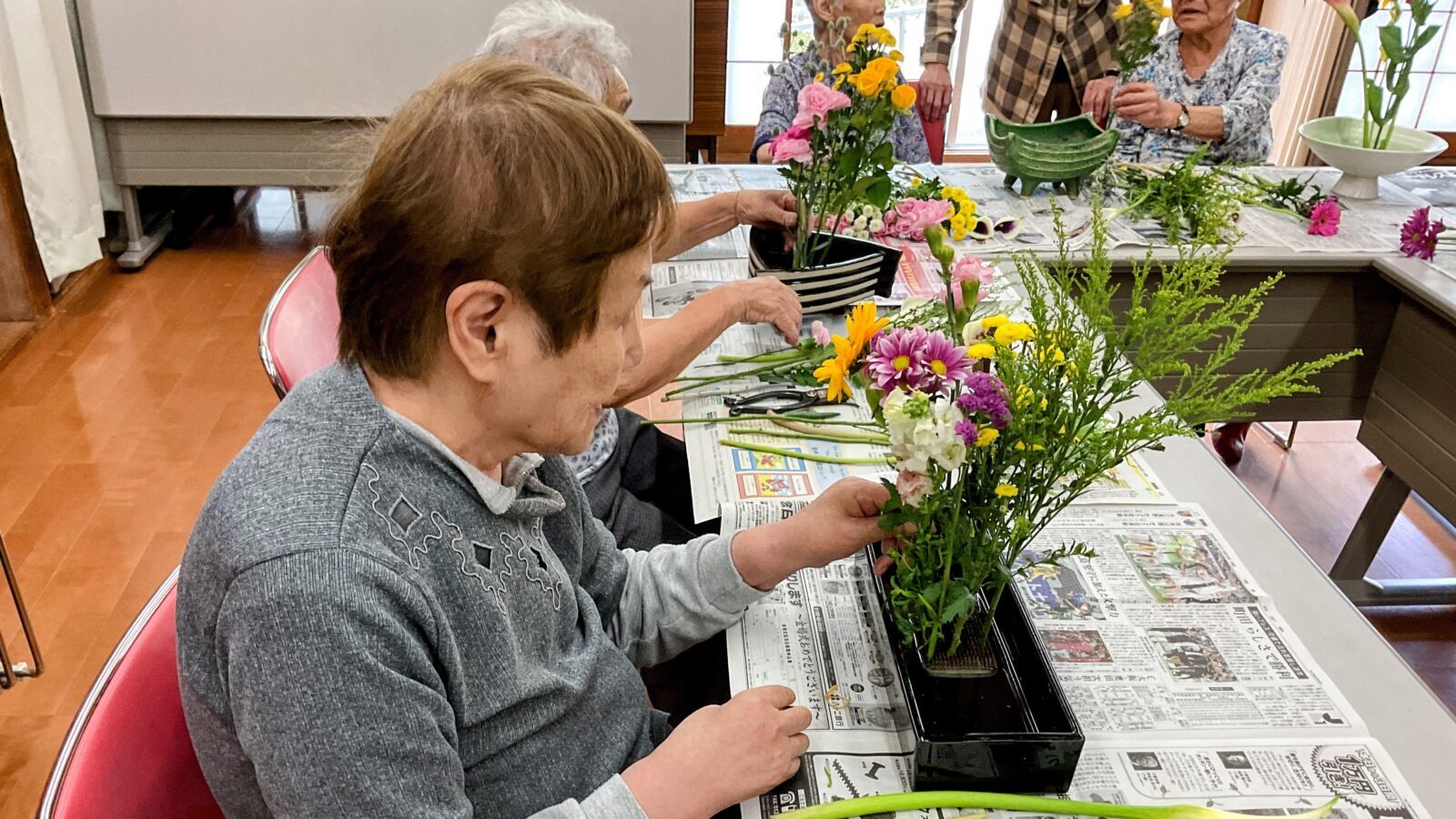 宅老所にはオープンキッチンを備えた広い食堂兼機能訓練室があり、少人数ならではのレクリエーションや、おやつ、昼食づくりなど、和気あいあいとした雰囲気の中でさまざまなサービスがご利用いただけます。